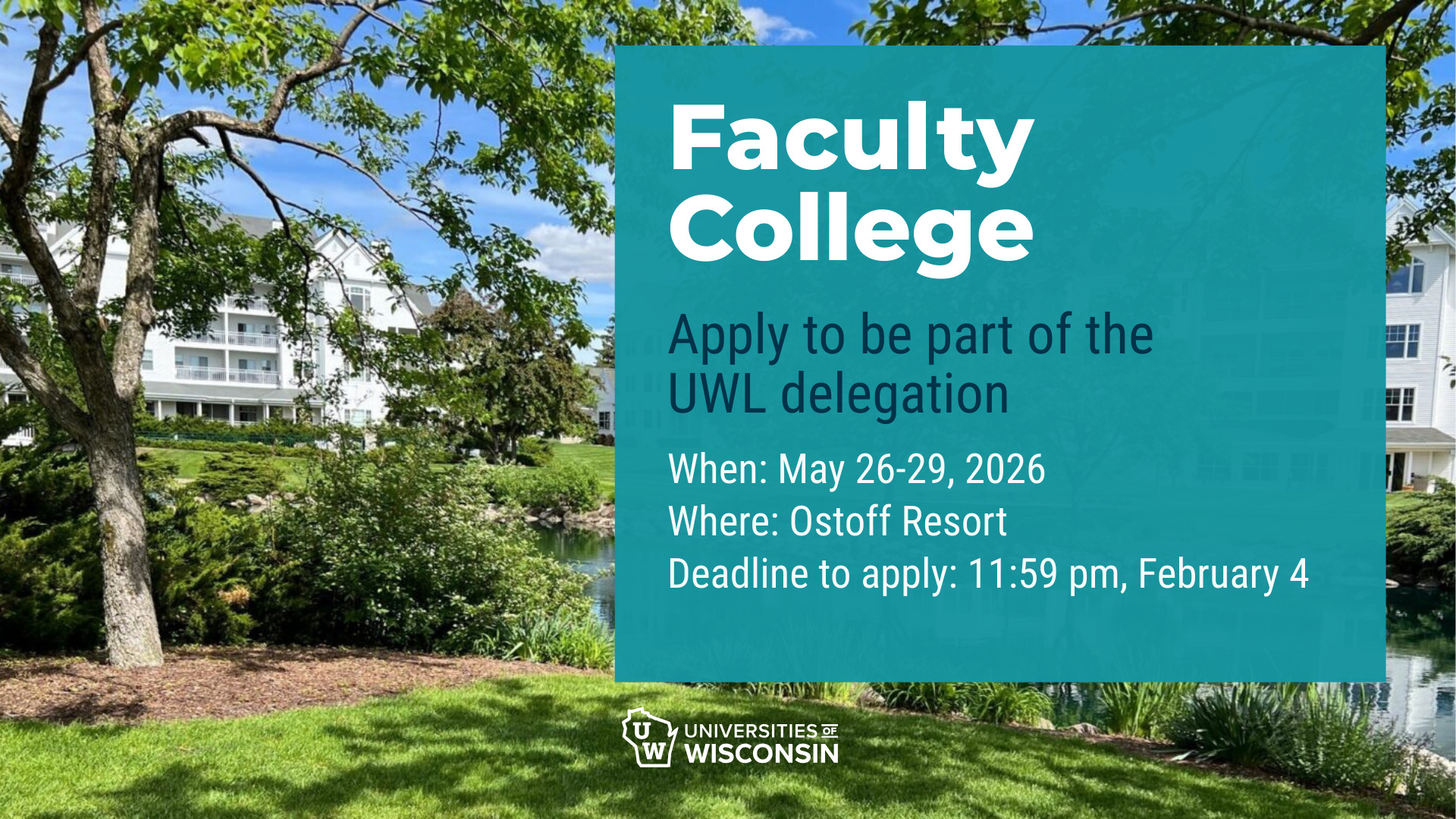 Attend Faculty College with the UWL delegation! CATL will support up to 7 UWL attendees, paying their registration and associated travel fees. You will know soon after this date if you were selected to be part of the delegation with fees paid. CATL will complete your registration if you are selected for the delegation. Complete the application before 11:59pm on Tuesday, February 4, 2026.