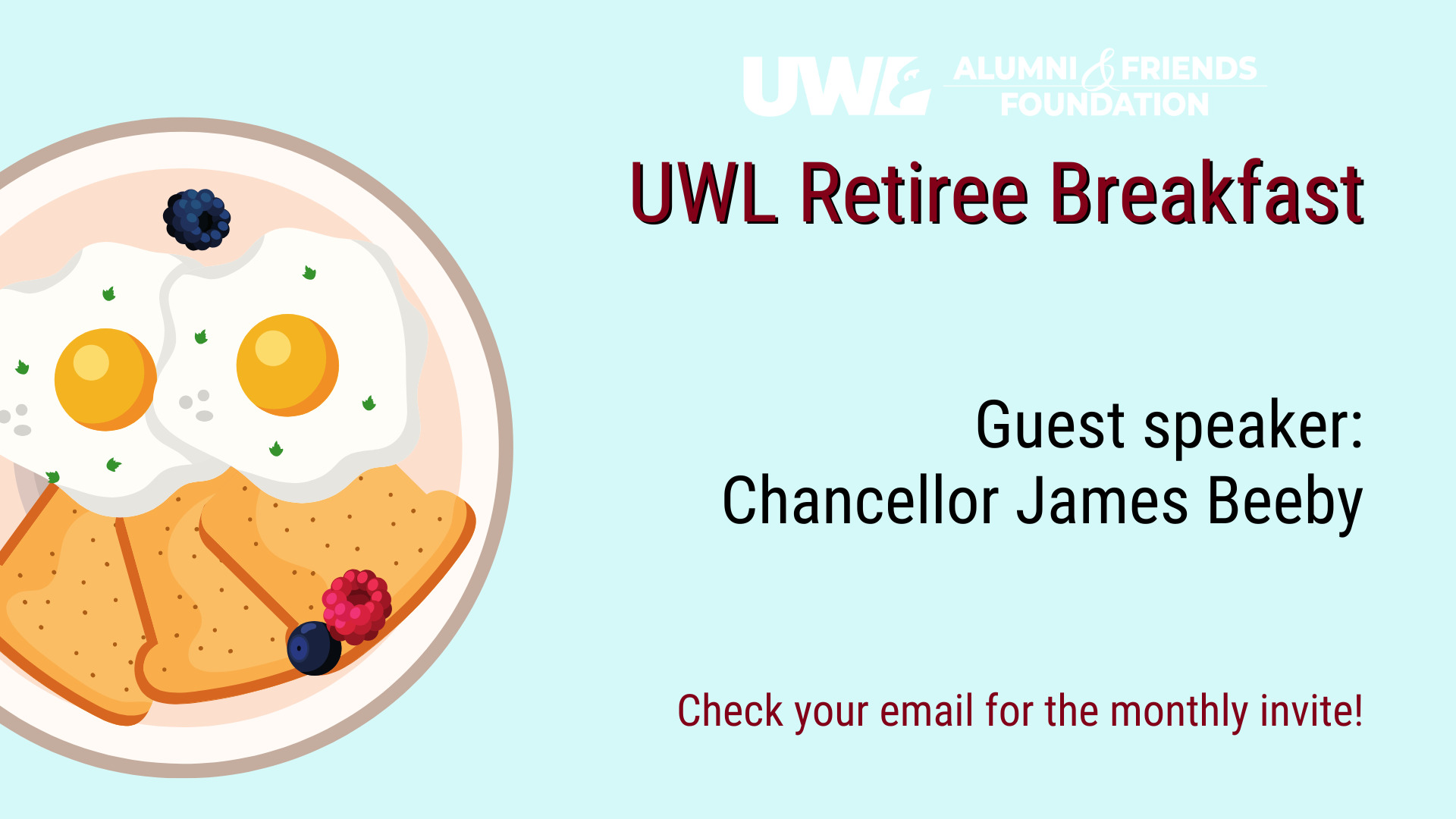Join us as we hear from UWL Chancellor James Beeby about UWL's drafted strategic plan and the overall planning process. You can expect a PowerPoint presentation along with socializing with fellow UWL retirees over a warm breakfast.