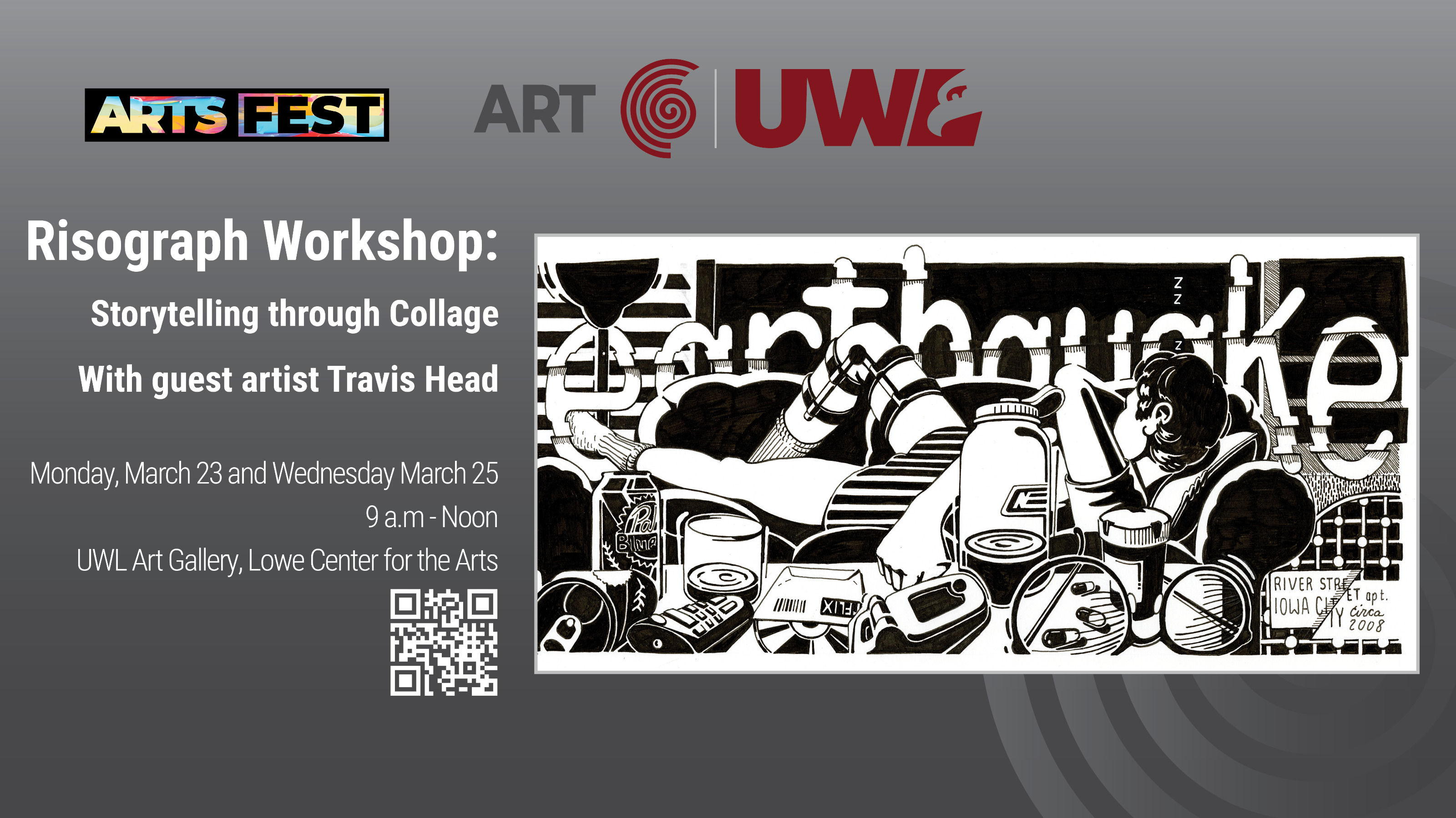All UWL Students are welcome to join visiting artist Travis Head for a hands-on Risograph workshop in the University Gallery. Participants will use drawing, writing, and collage to construct short personal narratives inspired by themes in Head’s exhibition, Travis Head: Busy Boys, Better Boys. The workshop will introduce Risograph printing techniques, including knockout and overprint methods, and participants will see their work printed during the session. The workshop event will conclude with the collaborative assembly of a simple, bound anthology featuring work created by workshop participants.