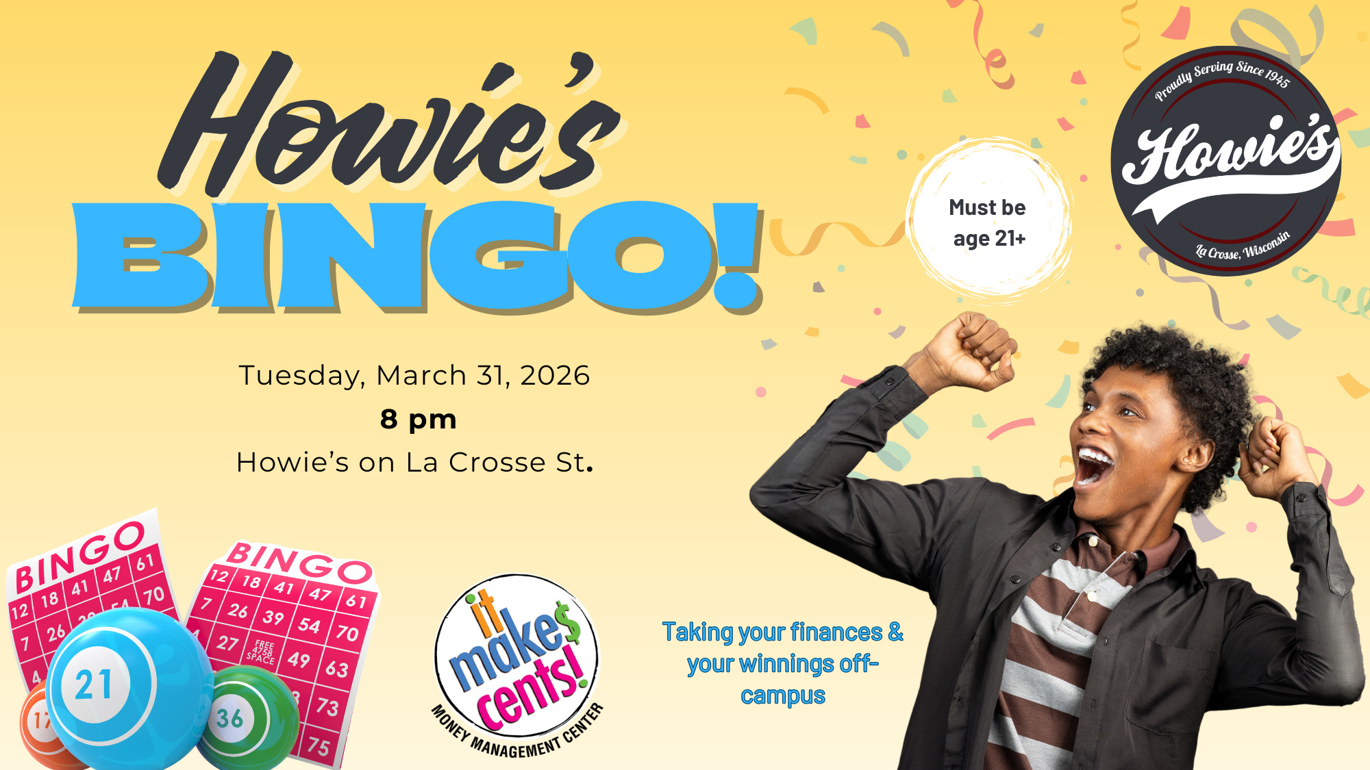 It Make$ Cents! to take your finances and winnings off-campus! Not only are we partnering with La Crosse's very own Howie's (right next to UWL) for a great night of bingo, but we have spectacular prizes to be won! Come learn about our IMC program and get the chance to win give-aways and prizes! Free and open to the public.