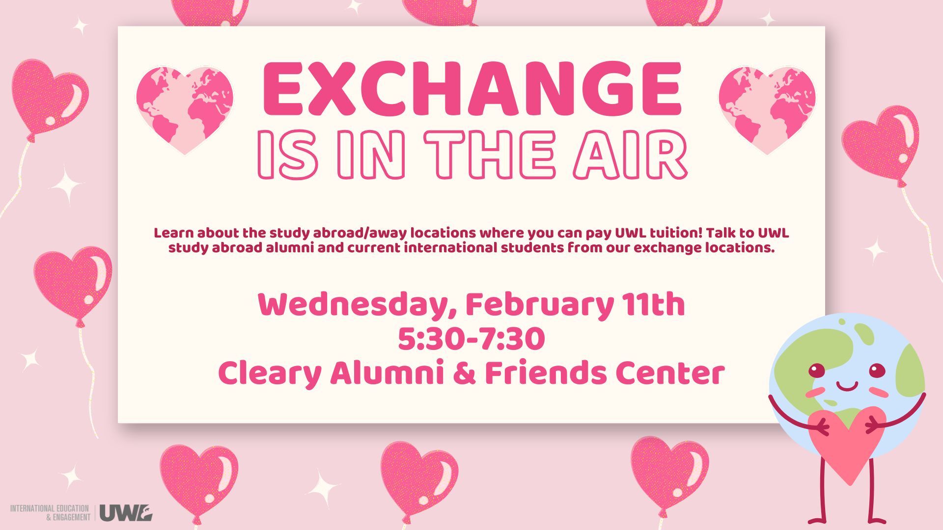 Pay UWL tuition and study abroad at one of our exchange partner locations. This event is a great way to learn the basics of the study abroad planning process, explore programs & locations and more; Plus, this event gives you a chance to talk to UWL study abroad exchange alumni and current international students from our partner locations!