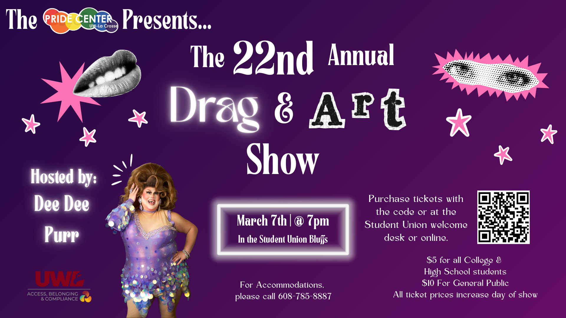Join the Pride Center, Rainbow, Unity, & Transform for our annual Drag and Art Show!!! This event is open to the campus and La Crosse community. We will celebrate students, faculty, staff, and alumni who celebrate the joy of gender, the love of the LGBTQ+ community, and bring us together as a supportive and loving community.