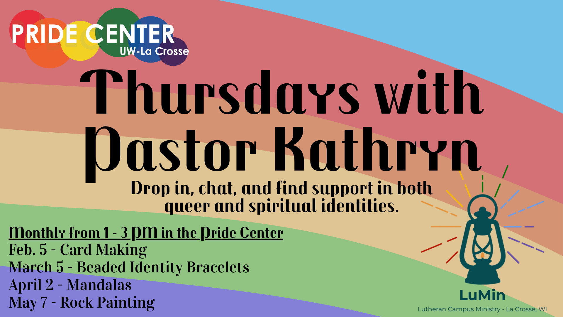 Every 1st Thursday of the month, join Pastor Kathryn from LuMin for a relaxed time for students to drop in, chat, and feel supported—both in their queer and spiritual identities. Each month, Pastor Kathryn will provide a craft activity.