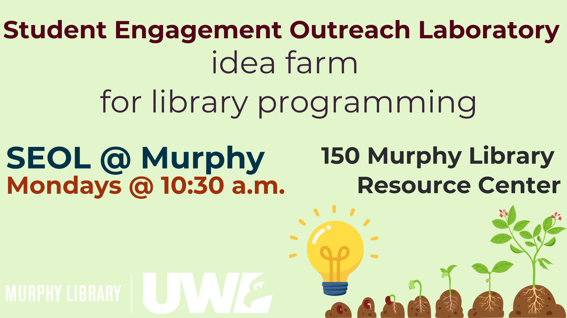Murphy Library's Student Engagement & Outreach Laboratory (SEOL) invites students, faculty, and staff to drop in and plant ideas for event programming in YOUR Library.