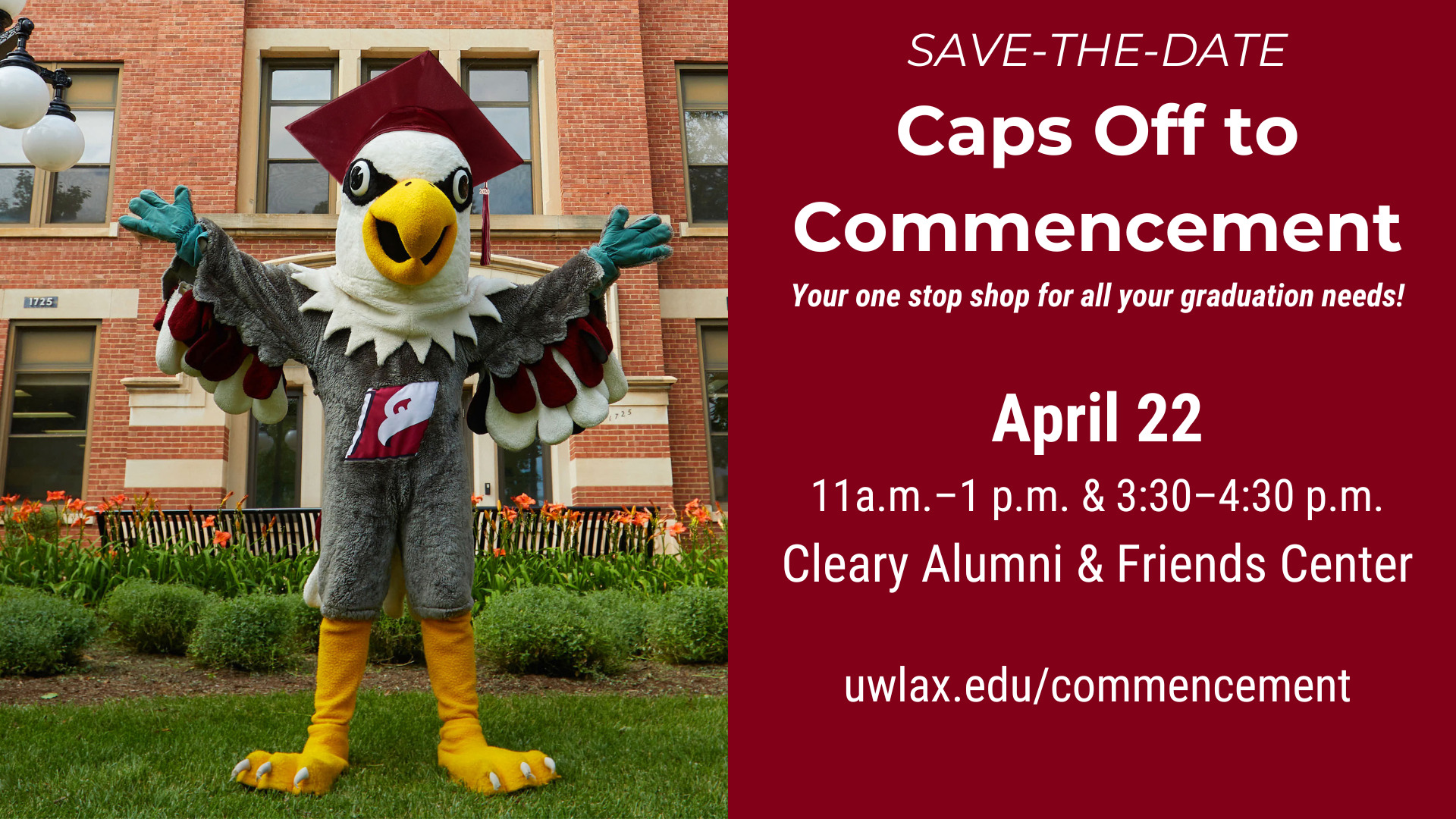 Planning to graduate in May? Mark your calendar for Caps Off to Commencement–your one stop shop for graduation needs. Celebrate and explore the resources available to you as a UWL graduate!