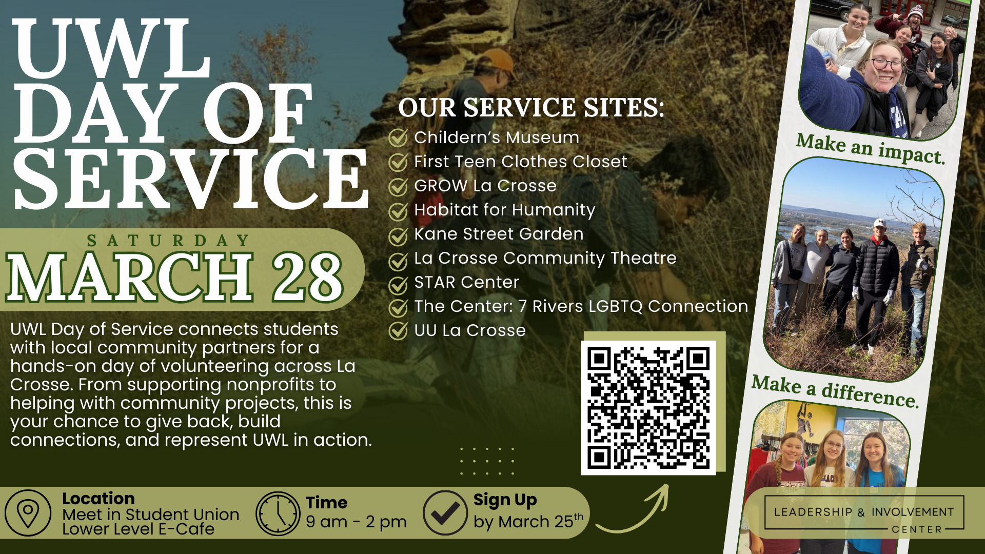UWL Day of Service connects students with local community partners for a hands-on day of volunteering across La Crosse. From supporting nonprofits to helping with community projects, this is your chance to give back, build connections, and represent UWL in action.