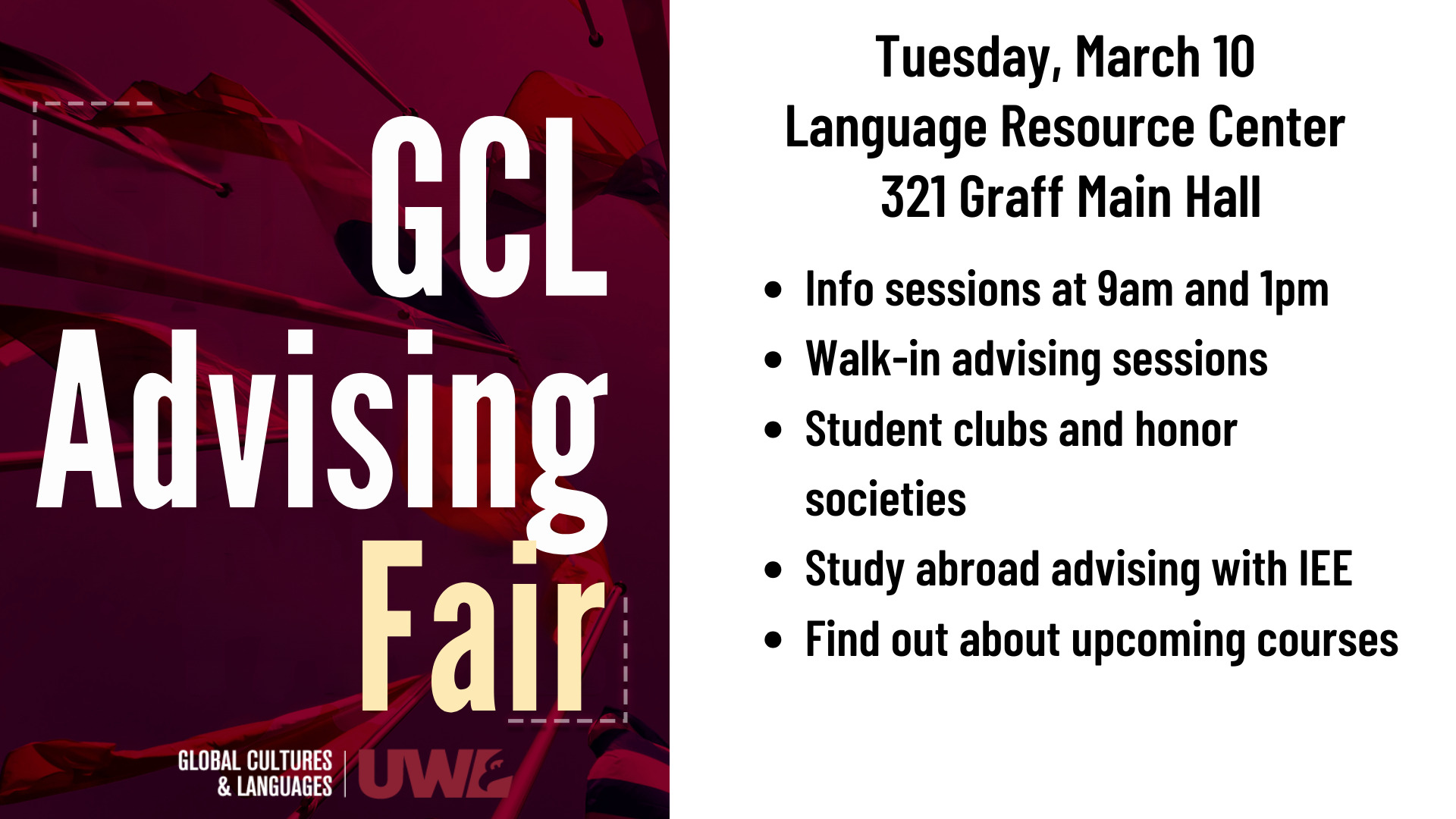 Join us on March 10th to learn about upcoming course offerings, study abroad opportunities, and more with help from faculty advisors from the Department of Global Cultures & Languages.