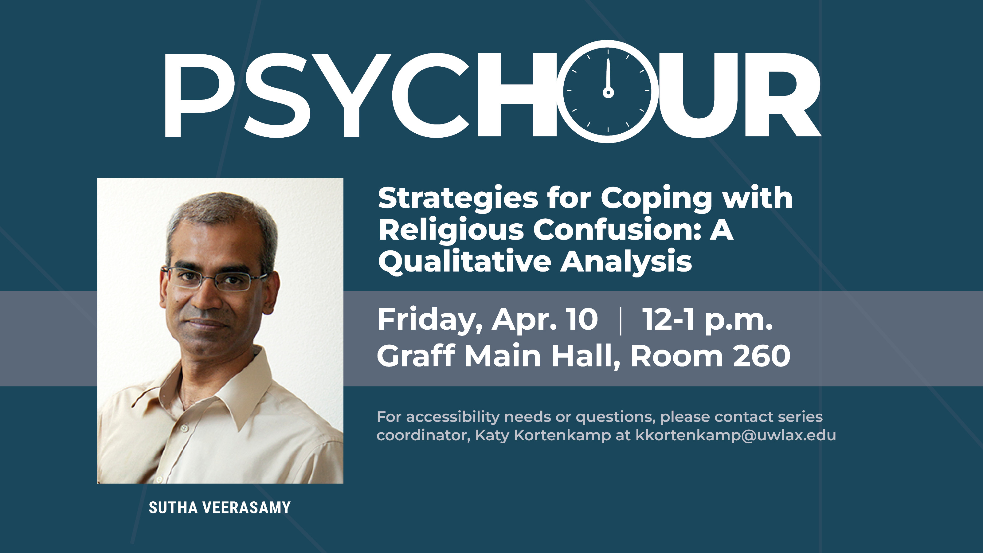 Dr. Sutha Veerasamy and his research team will talk about their qualitative research on coping with religious confusion. Dr. Sutha is an assistant professor in the UWL Psychology department. This event is free and open to the public.