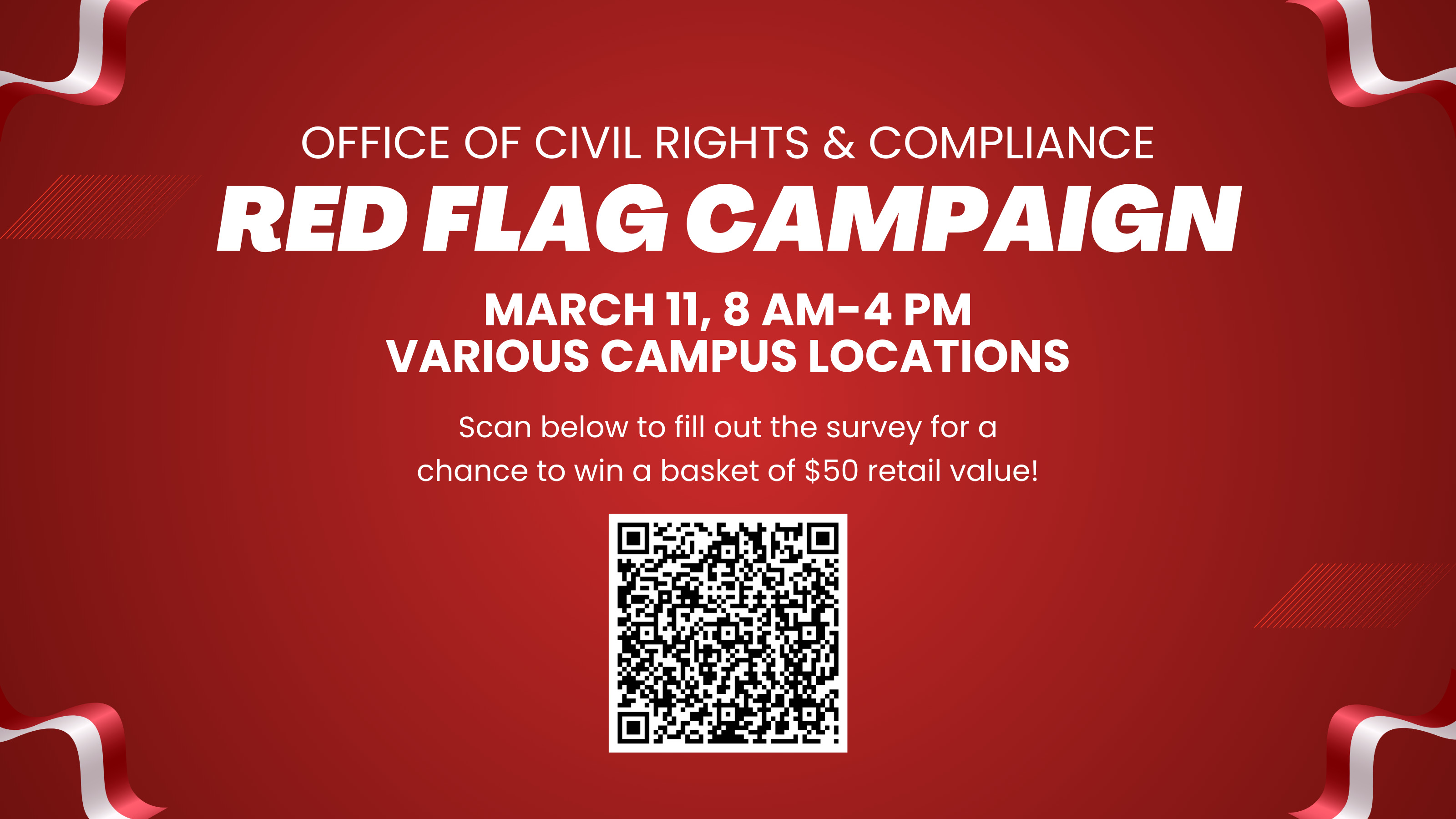The Office of Civil Rights & Compliance is participating in a new public awareness campaign. The Red Flag Campaign addresses dating violence on campus and will appear on our campus beginning March 11, 2026. Designed with a bystander intervention strategy, the campaign encourages friends and other campus community members to say something when they see warning signs (red flags) for dating violence in a friend’s relationship.