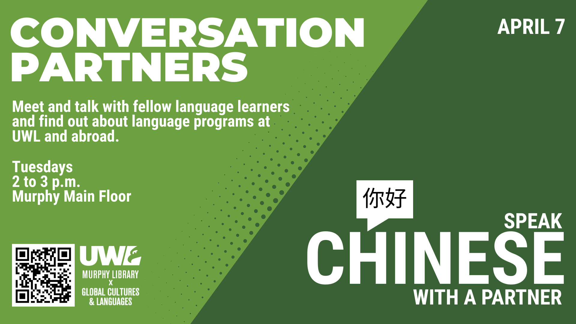 Connect and communicate with Conversation Partners and Student Orgs from the Department of Global Cultures & Languages at this Murphy Library collab every Tuesday at 2, starting on March 24, 2026.