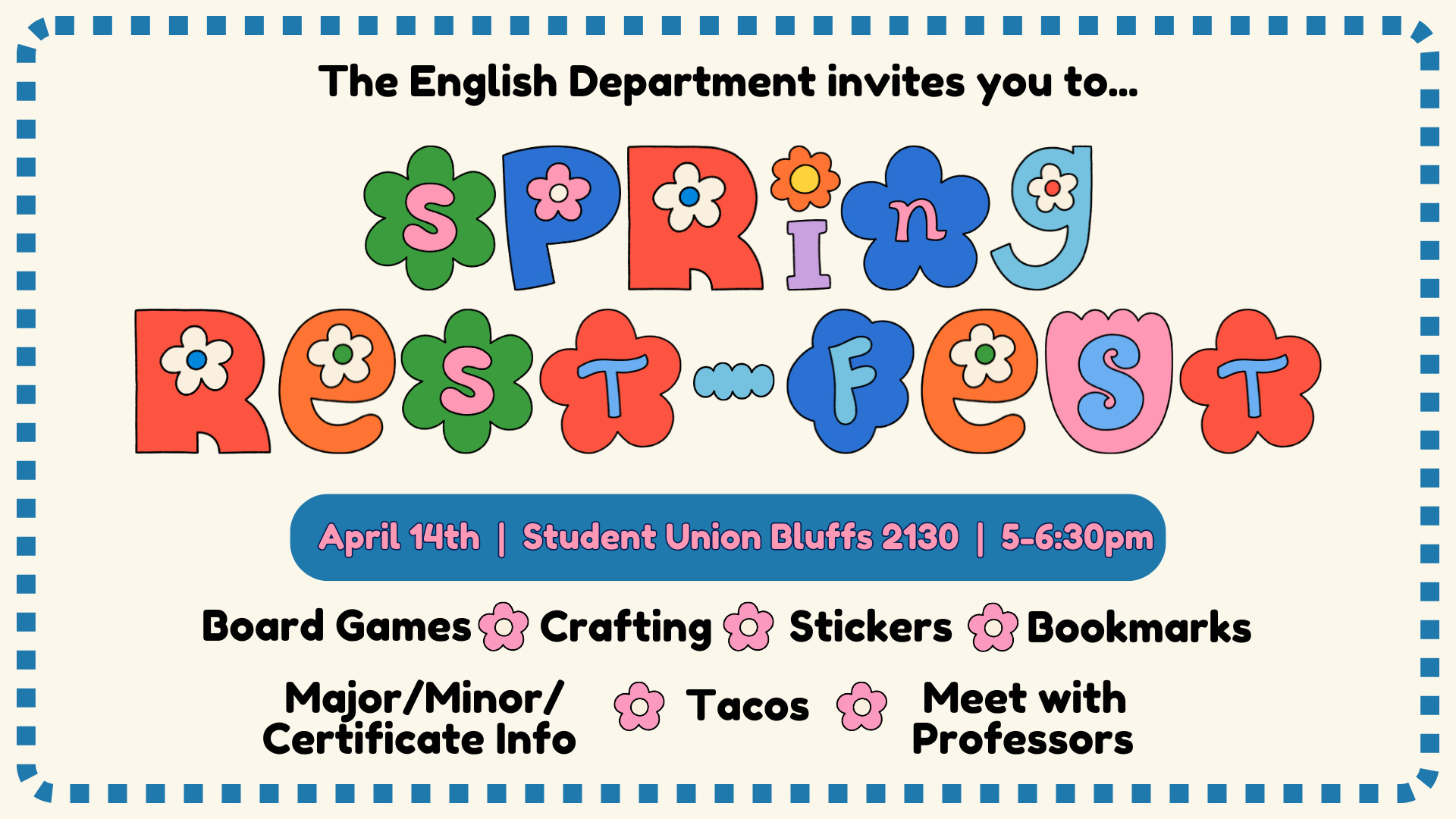 Join us on Tuesday, April 14 from 5:00-6:30 p.m. in 2130 Student Union for the English Department Spring Rest Fest! We will have fun games, prizes, snacks, an opportunity to meet other English majors and minors, and so much more. English faculty will be available for advising and general questions. We can't wait to see you there!