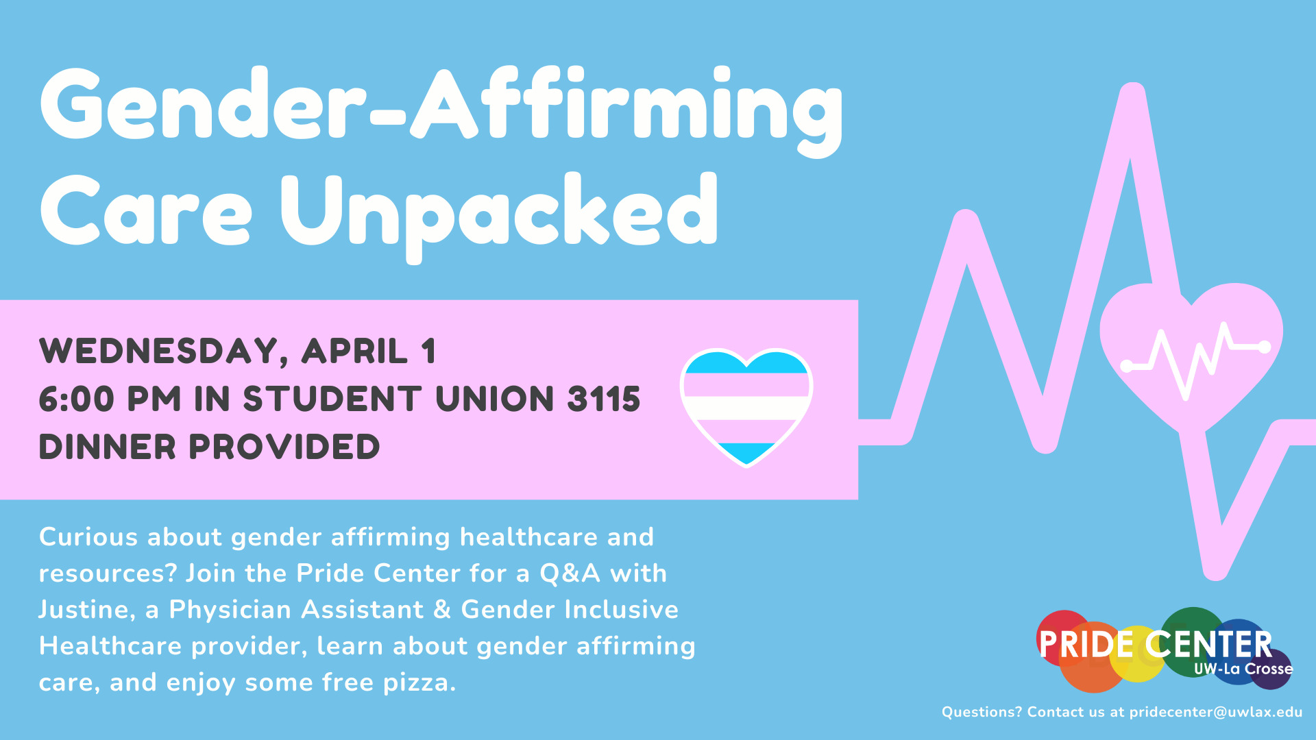 Curious about gender affirming healthcare and resources? Join the Pride Center for a Q&A with Justine, a Physician Assistant & Gender Inclusive Healthcare provider, learn about gender affirming care, and enjoy some free pizza.