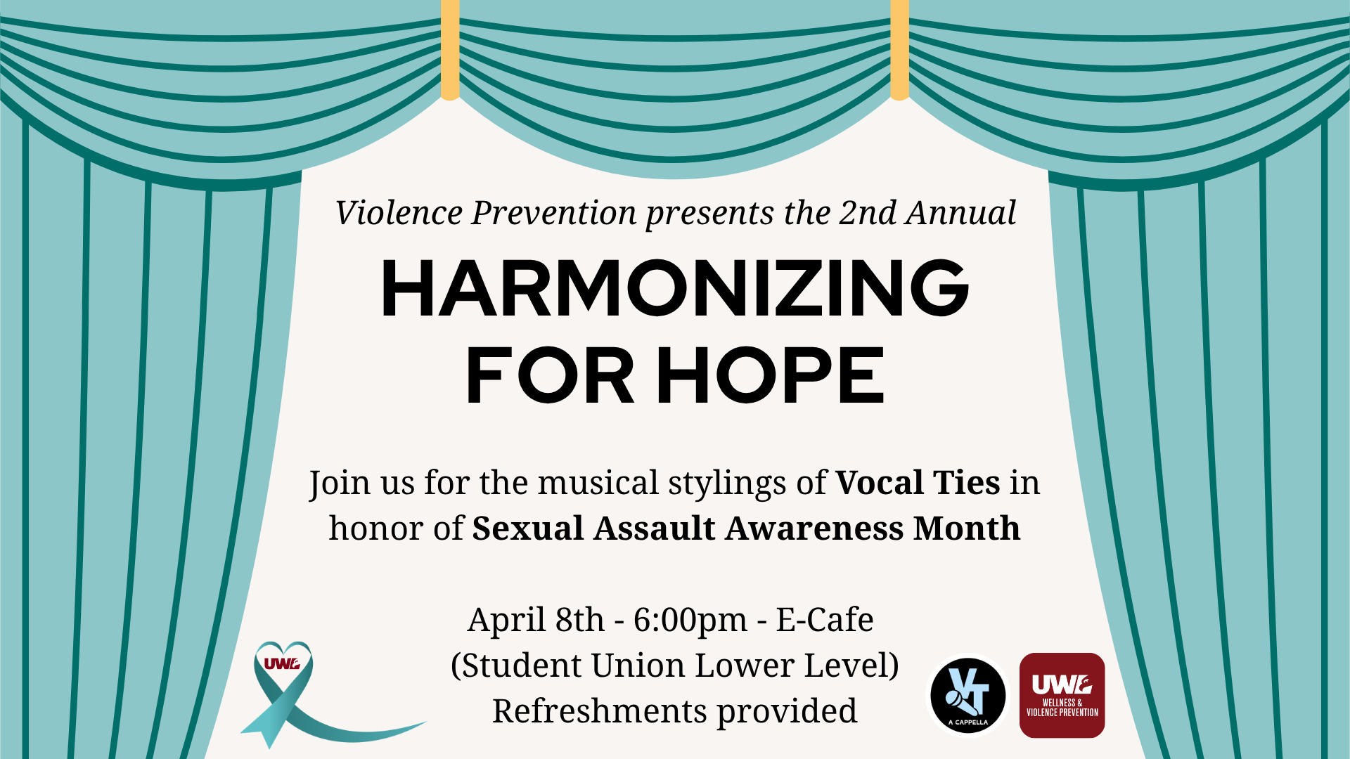 Join us in the E-Cafe for snacks, music and fun. We will be honoring survivors of sexual violence while hearing the musical stylings of Vocal Ties!