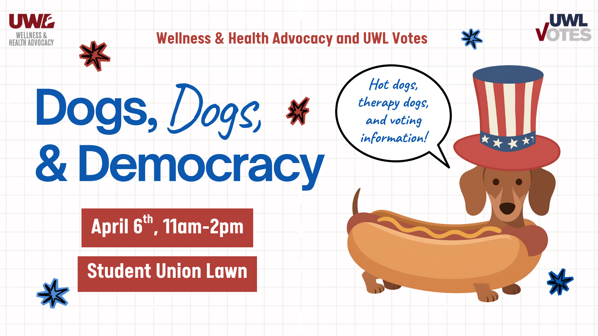 Swing by for a free hot dog lunch, hang out with therapy dogs, play some cornhole, and pick up quick tips on the April election and voter wellness. It's the perfect way to relax, get informed, and feel prepared to vote!