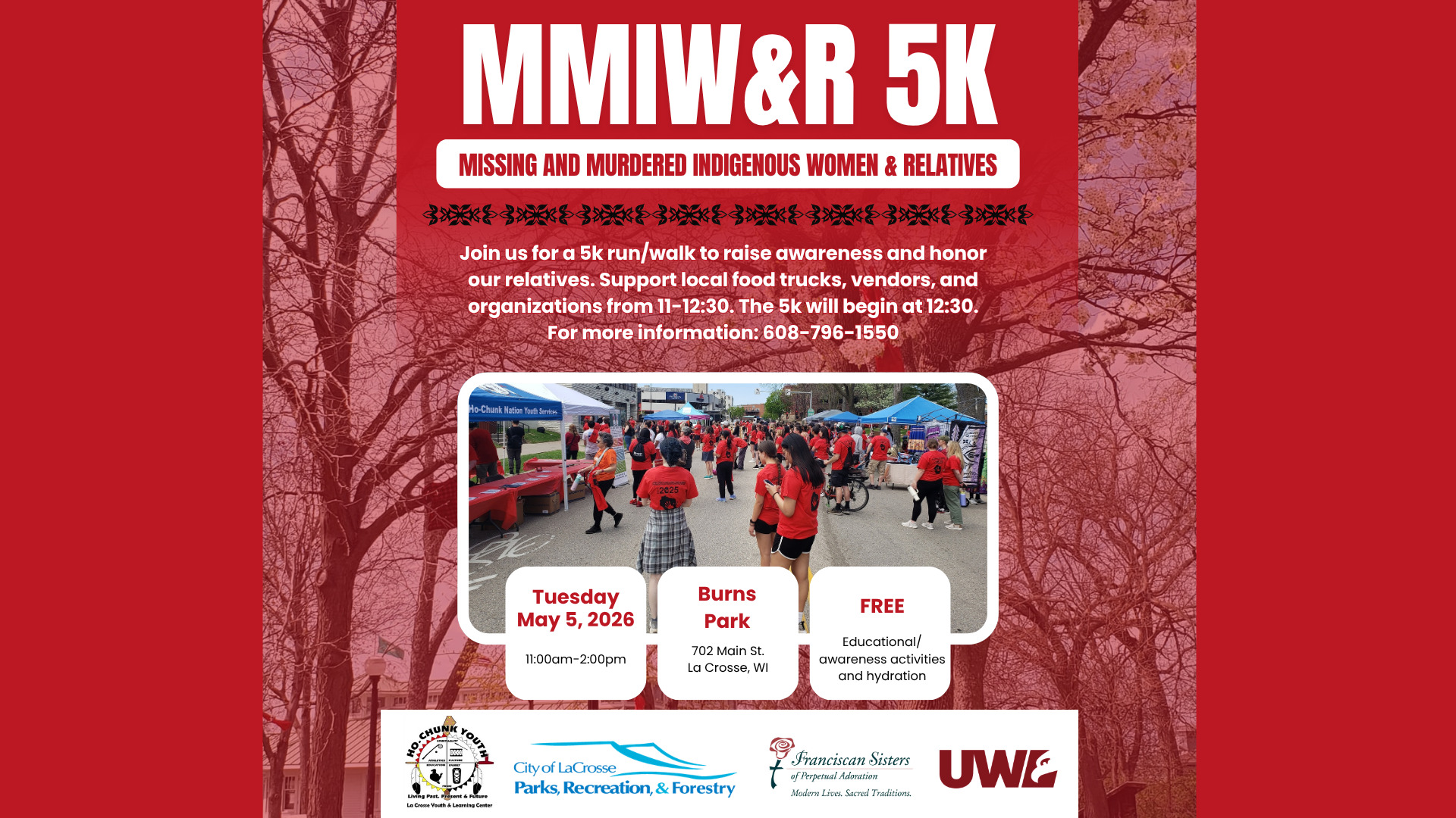 Join us for a 5k run/walk to raise awareness and honor our relatives. Support local food trucks, vendors, and organizations from 11-12:30. The 5k will begin at 12:30. For more information: 608-796-1550