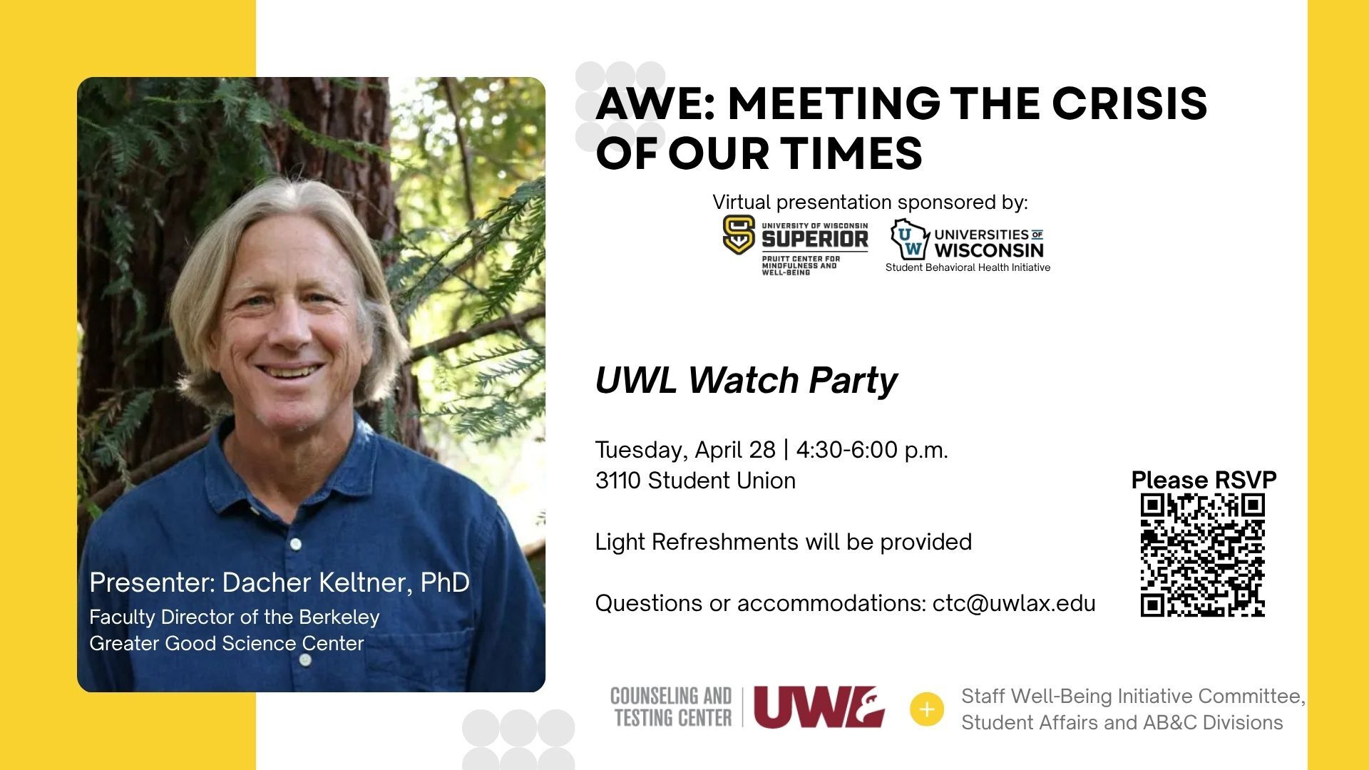 UWL Faculty/Staff Watch Party for Awe: Meeting the Crisis of our Times by Dacher Keltner, PhD