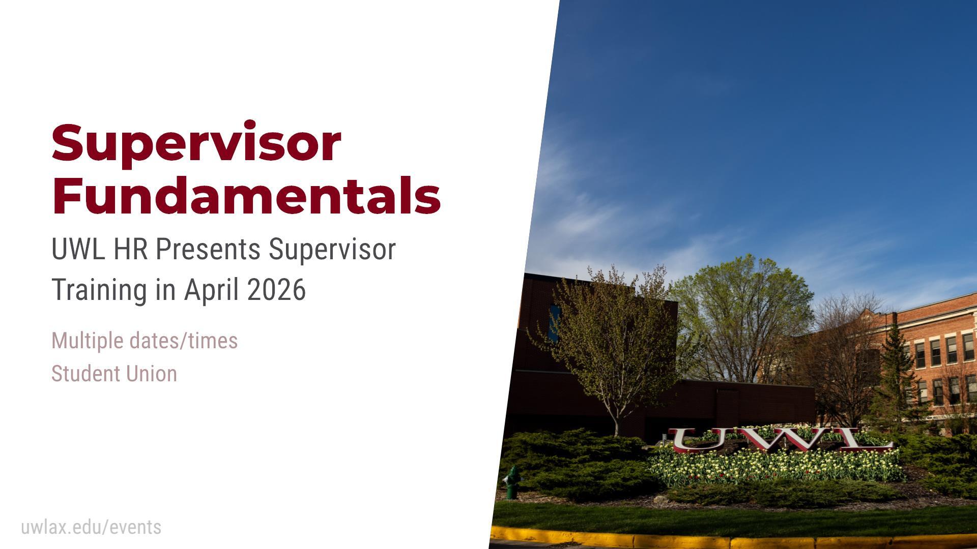 Join us for a two session Supervisor Training hosted by UW-La Crosse HR! This program is scheduled for April 28th and 30th from 8:30am to 12pm in Student Union room 3105.