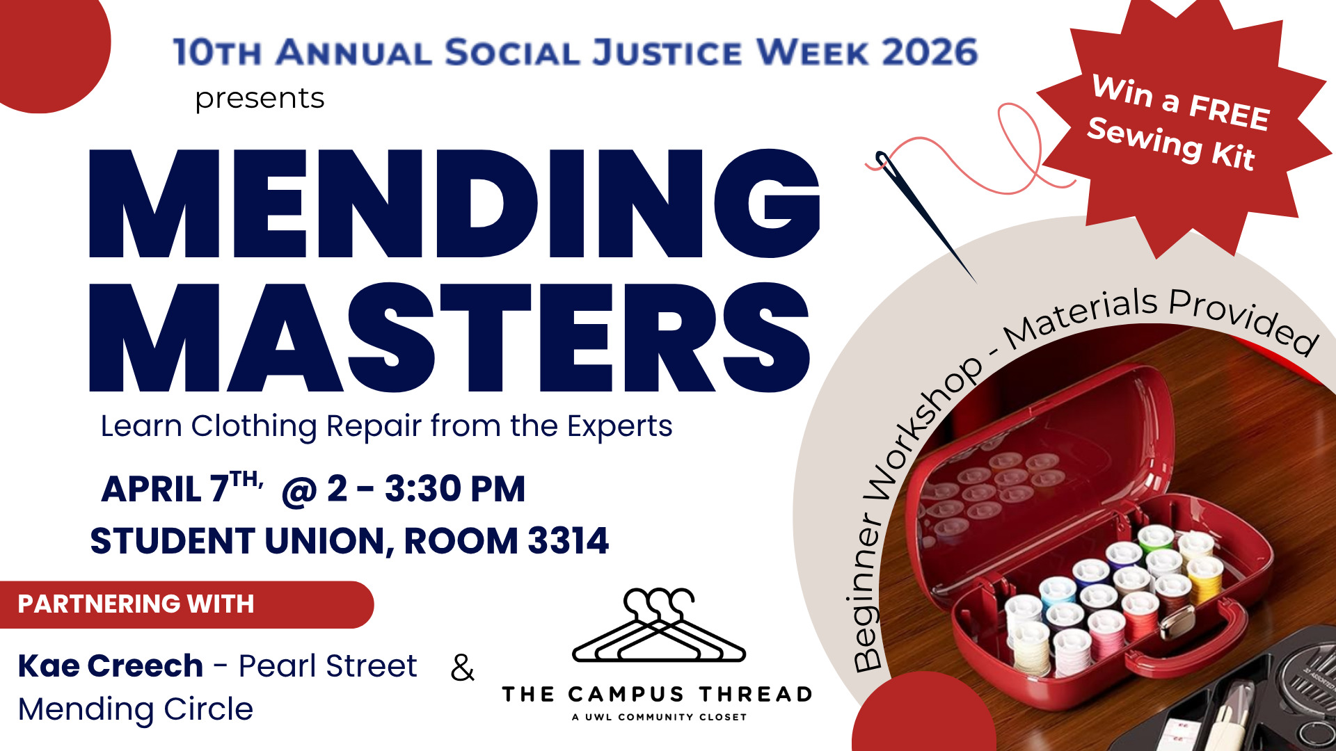 Mending Masters invites participants to explore clothing repair as a practice of community care, creativity, and sustainability. In a culture built on disposability, mending becomes an act of resistance, extending the life of garments while acknowledging the labor, materials, and stories they hold.