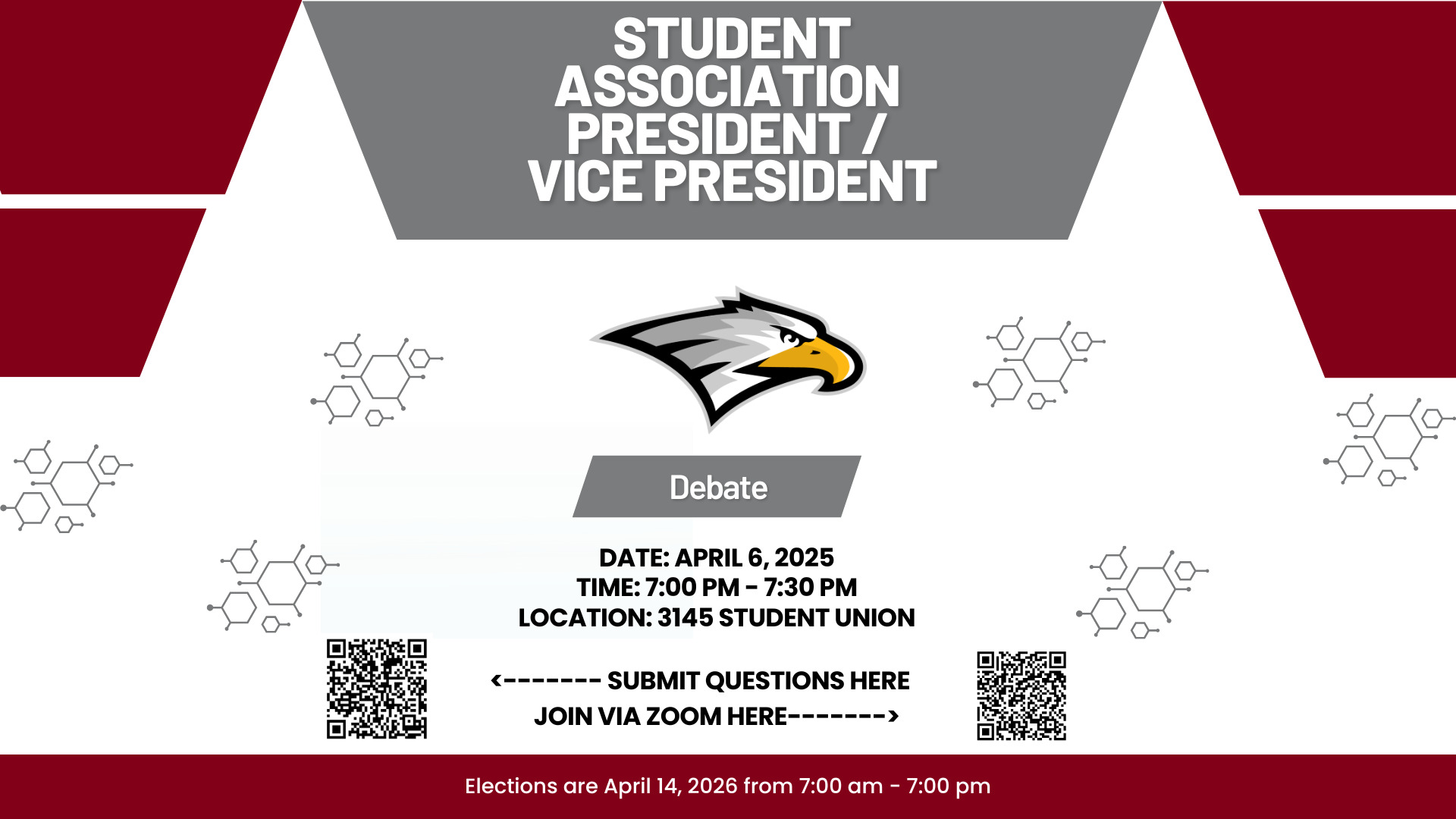Come and ask questions to learn about the candidates running for President and Vice President in the Student Association elections.
