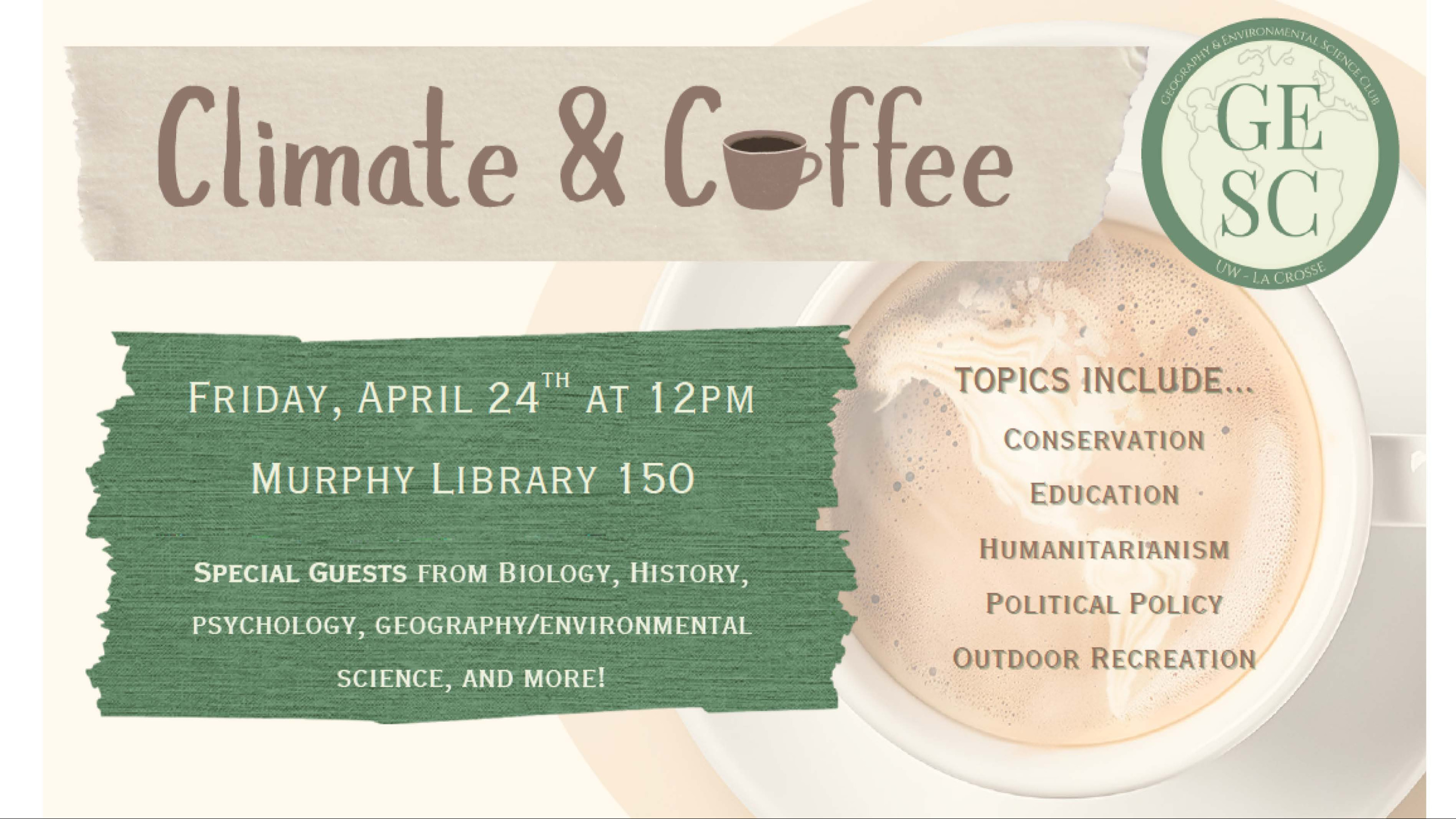 Come enjoy special guest speakers from Biology, History, Geography and Environmental Science, Education, Political Science and more as they provide 15 minutes presentations on climate and its impacts on us and our environment as seen through different lenses. Drop in for one or for all and don't forget you can swing by Murphy's Mug to purchase a coffee, beverage or lunch to enjoy while enjoying some thought provoking talks.