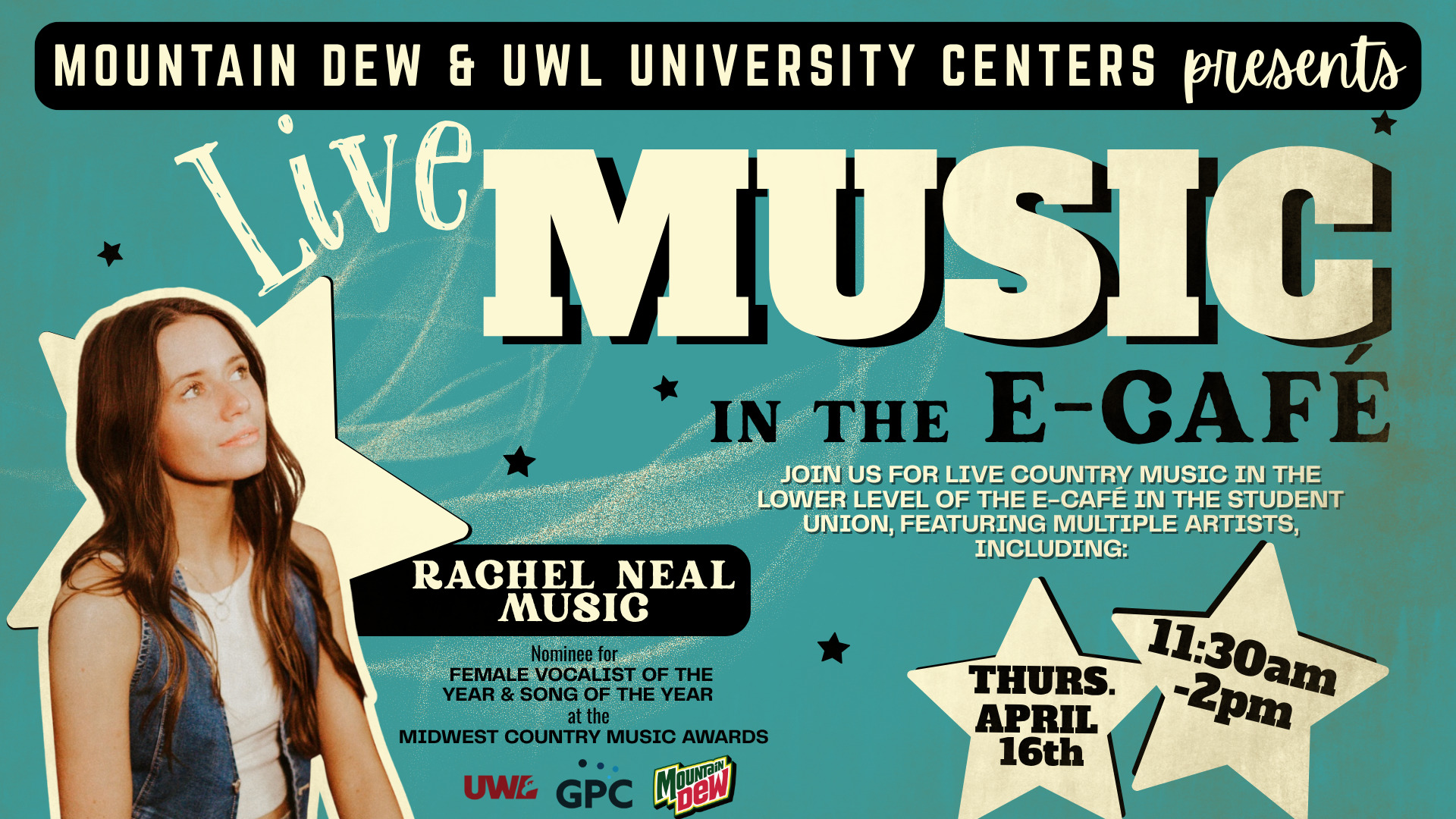 Join us for some live country music in the E-Cafe, brought to you by Mountain Dew, Gillette Pepsi Companies, and University Centers! This event is free, and will feature artists who are nominated for "Artist of the Year" at the Midwest Country Music Festival Awards. Stop by for some great entertainment and FREE Pepsi Samples!