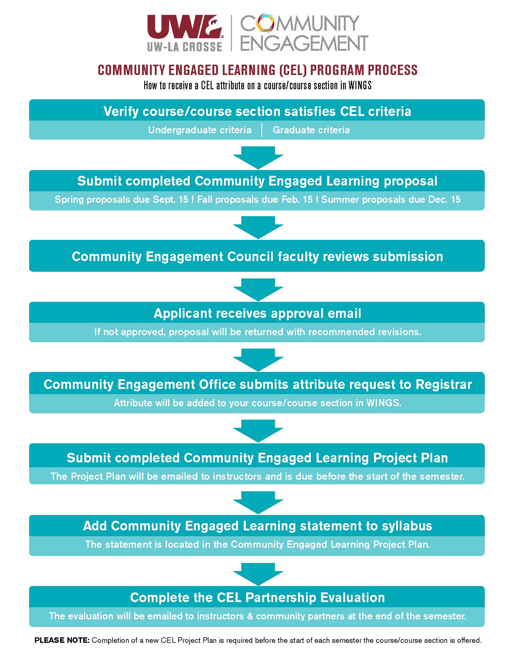If your course meets the criteria to be a part of the CEL program, instructors are invited to apply for a designation to be added to their course section in WINGS. Once approved, the designation remains on the course and can be added or removed at the request of the instructor at any time. The designation will be reviewed every five years. Learn more about the CEL program process.