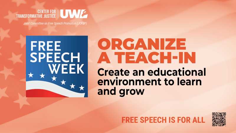 Digital sign of Free Speech Week. Organize a teach-in. Create an educational environment to learn and grow.