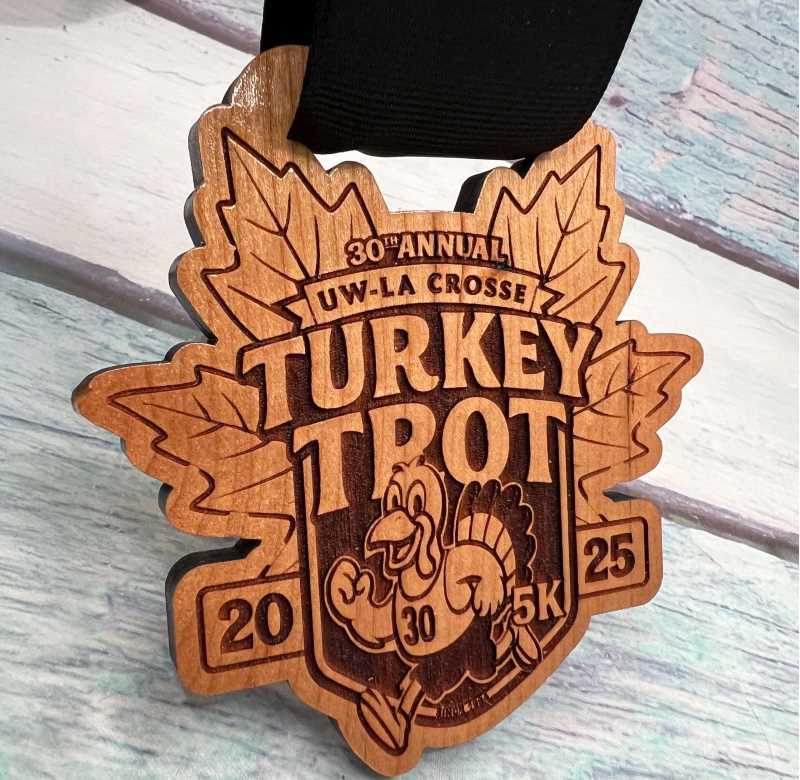 Photo of the engraved wooden race medal for the 2025 Turkey Trot