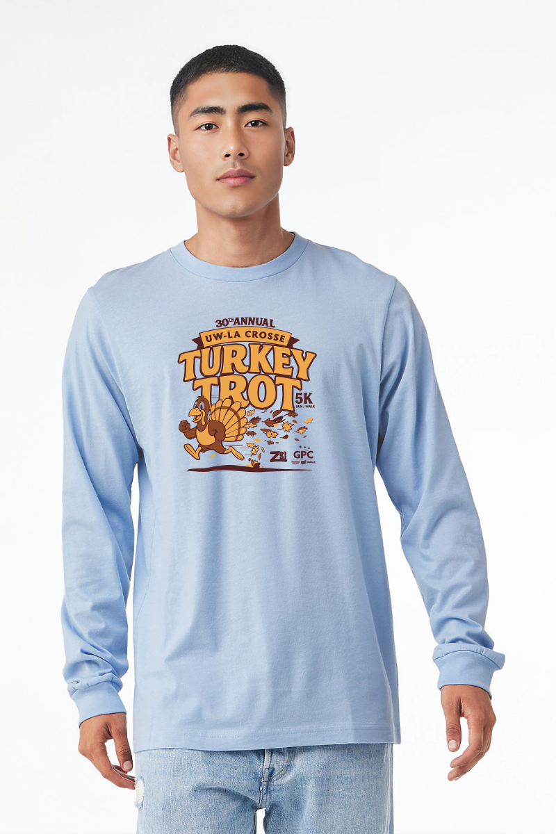 Photo of a man wearing the light blue long sleeve event race shirt showing the 2025 design