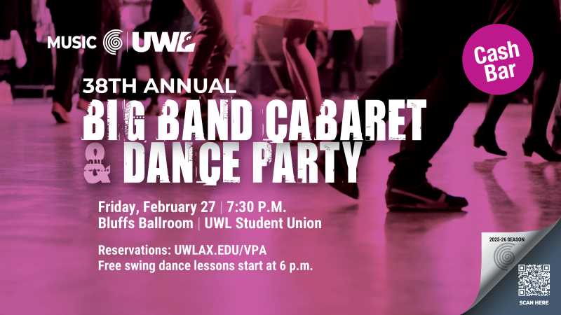 For more than two decades, Big Band Cabaret & Dance Party has been a highlight of the performance year! There is no better excuse to lace up those dance shoes and join us for an unforgettable night of music and fun. Swing dance lessons included! This year, we are expanding our repertoire to include music from many different dance traditions including salsa, funk, tango, and swing. Featuring the UW-La Crosse Tuxedo Dance Orchestra (Jazz Orchestra) and Black Coat Jazz Band(Jazz Ensemble) with band leader Jon Ailabouni. Dr. Eddie Kim will be leading a dance lessons to teach the basics of swing for beginners and those wanting are refresher from 6:00-7:15 p.m. Cash bar. Advance reservations highly recommended for quicker seating upon arrival.