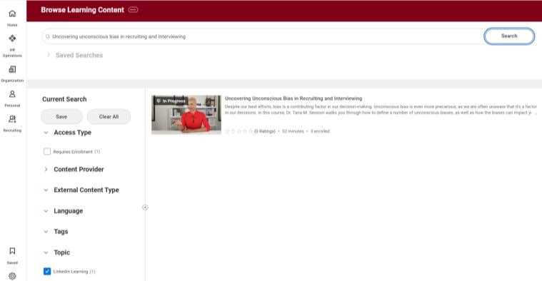 HR Topics - In the Browse Learning search bar, type “Uncovering unconscious bias in recruiting and interviewing.” Enroll in and complete the course.