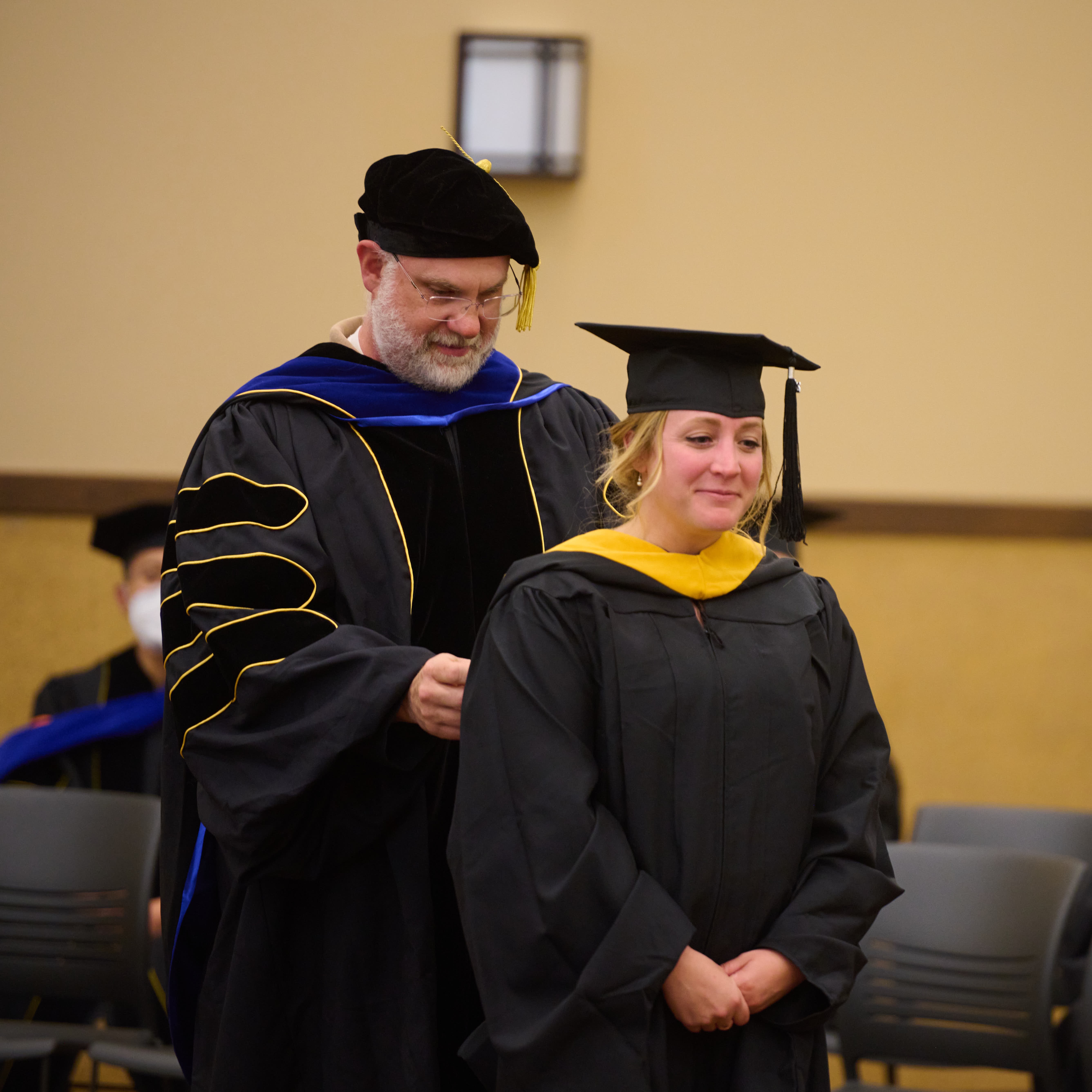 The Hooding Ceremony involves a faculty member putting the hood on each graduate. Students who wish to attend should order an academic hood, cap and gown from the University Bookstore.