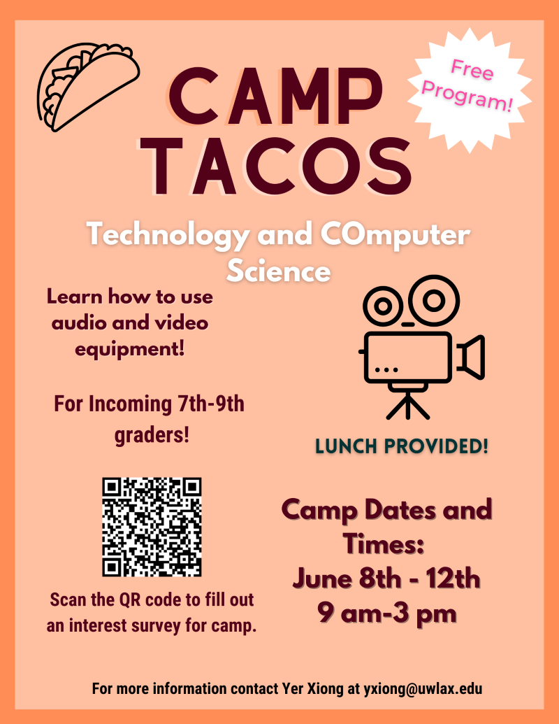 TACOS Camp is a day camp for students entering 7th-9th grade in Fall 2025. This camp will focus on fundamentals of computer science and first -hand experience! This summer campers will learn about videography! 10-15 students from the greater La Crosse area will spend 6 hours per day on campus Monday-Friday to form an intercultural community along with pre-college staff and college student camp counselors.