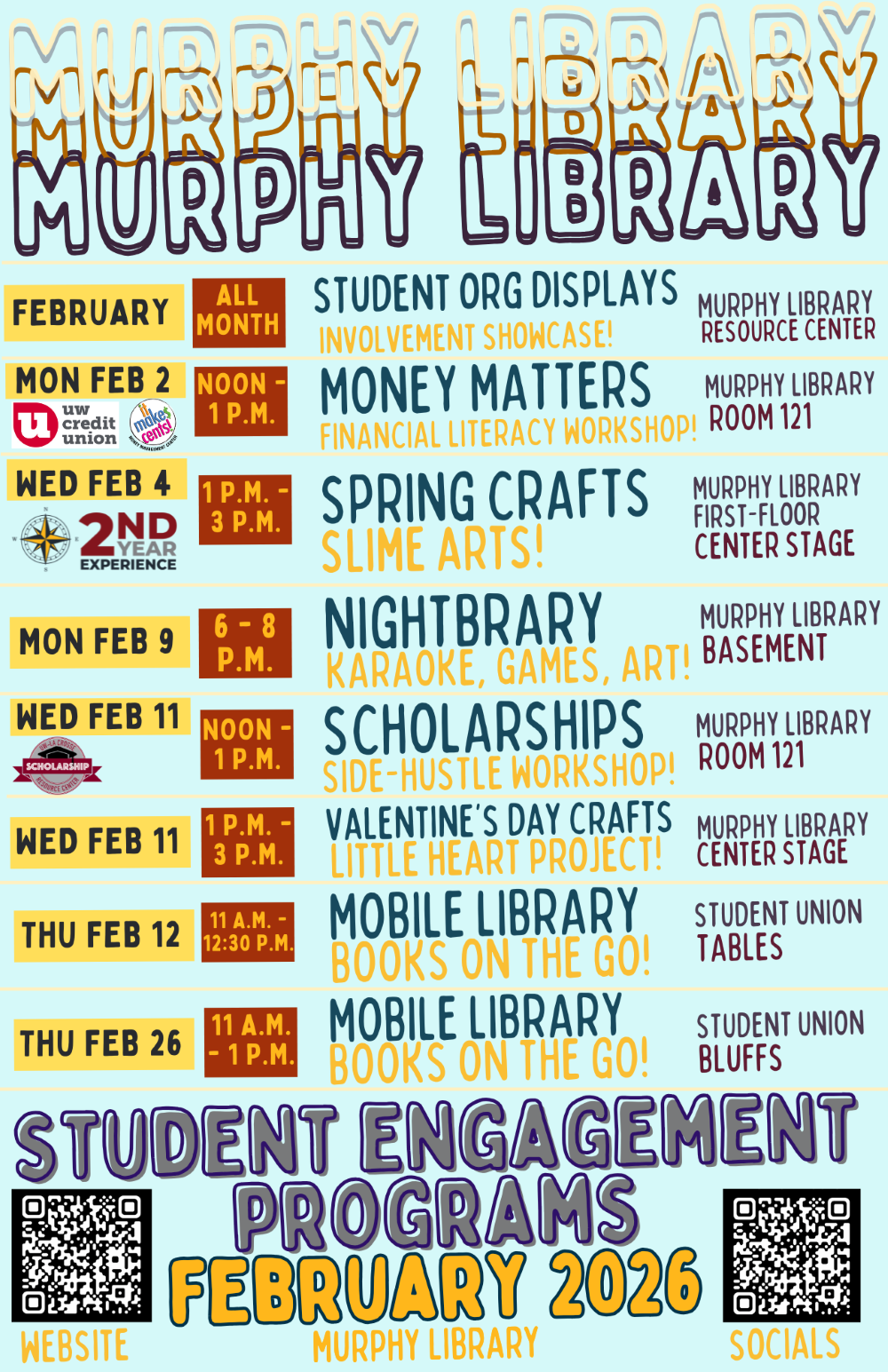 Murphy Library is offering a variety of student engagement events, programs, and workshops to kick off the Spring 2026 semester.