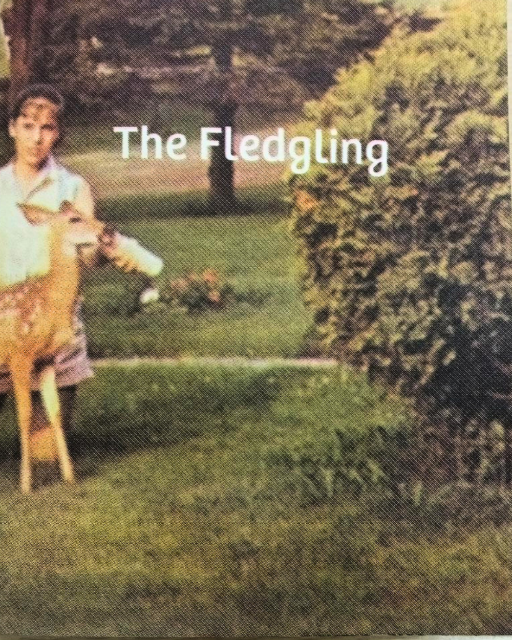 Alt text: Student arts and literature zine, "The Fledging". Title in white text with an image of a girl feeding a young doe.