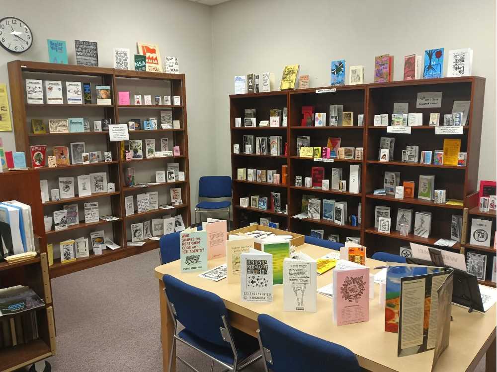 Over the summer, the ZRR relocated to Murphy 120, offering significantly more space for the growing collection. The new location maintains regular hours throughout the semester, welcoming students, faculty, and community members to browse, engage, and explore a collaborative collection where alternative publishing traditions meet contemporary campus life.