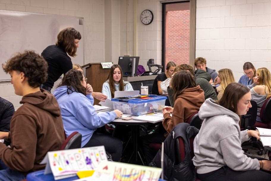 Alt text: HIS 110 students in Dr. Ariel Beaujot's classroom creating zines at their tables.
