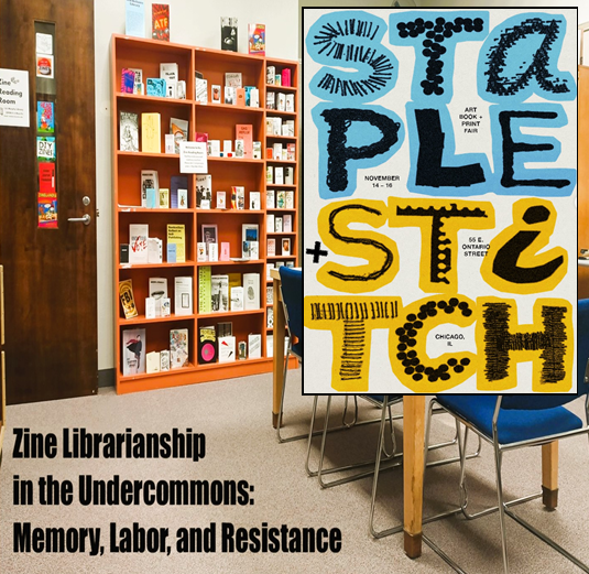Alt text: Print fair promotional poster that reads "Staple + Stitch" and an image of the Zine Reading Room bookshelves. Text on the bottom left of the image in black reads "Zine Librarianship in the Undercommons: Memory, Labor, and Resistance"