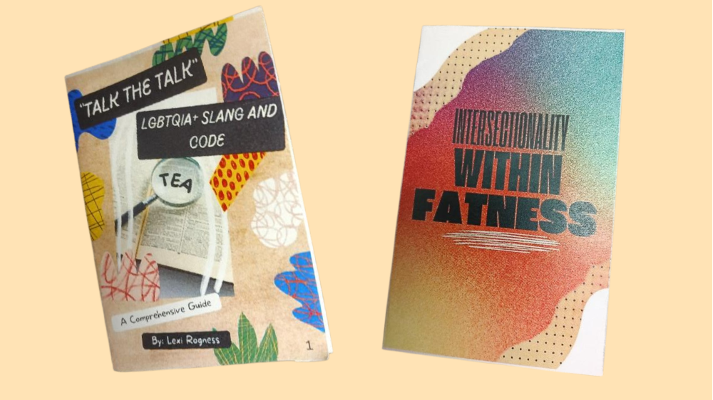 Alt text: Two zines: "Talk the Talk: LGBTQIA+ slang and code by Lexi Rogness" and "Intersectionality within fatness by Alex Morris"