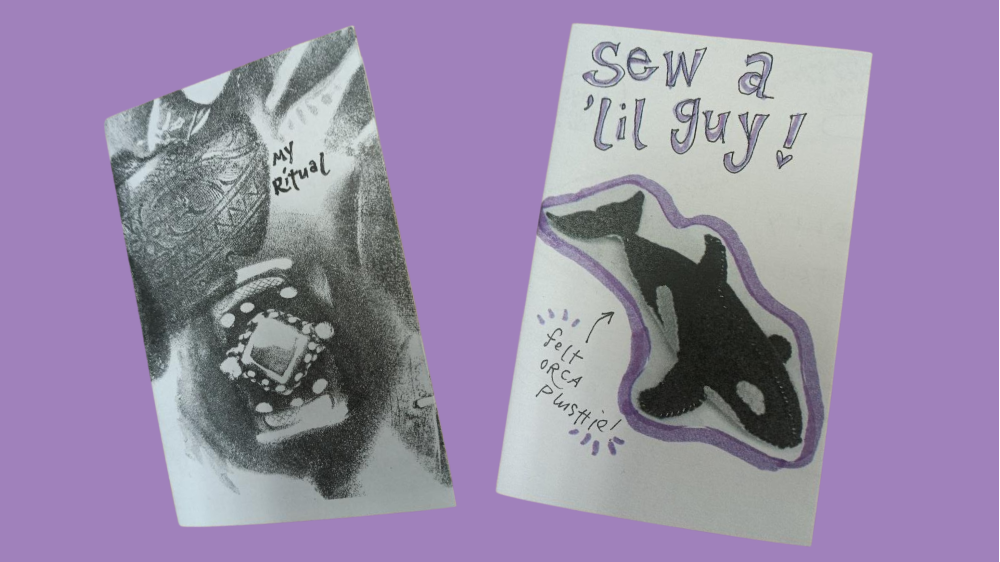 Alt text: Two zines from local artists Tiana Traffas, and her daughter, Luna: "My Ritual" and "Sew a 'lil guy!".