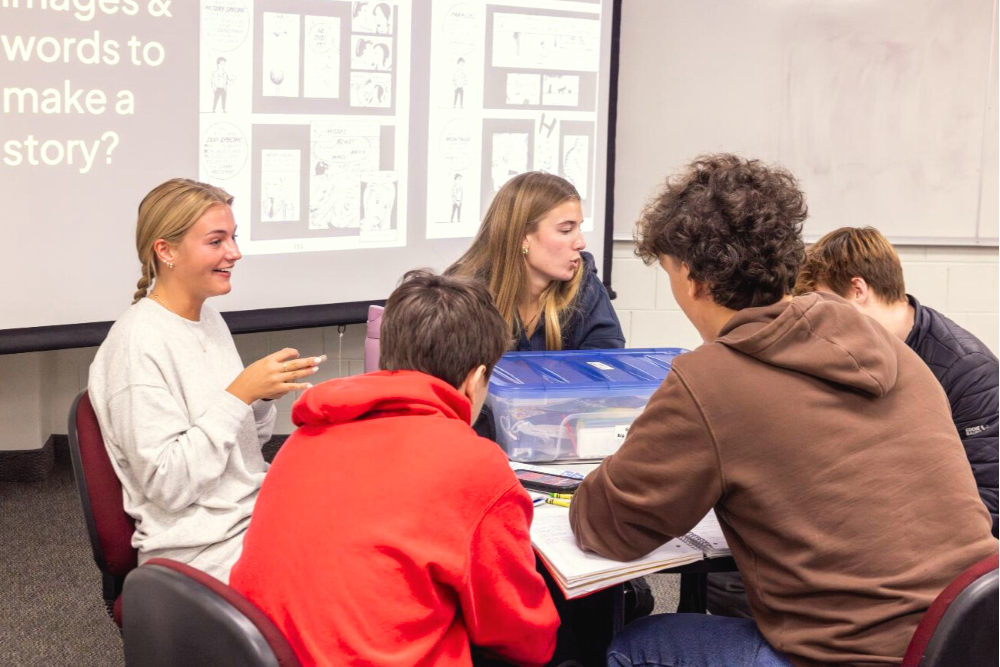 Alt text: Five HIS 110 students talking to each other at a table in a zine-based literacy instruction session. Zine creation materials are on the table.