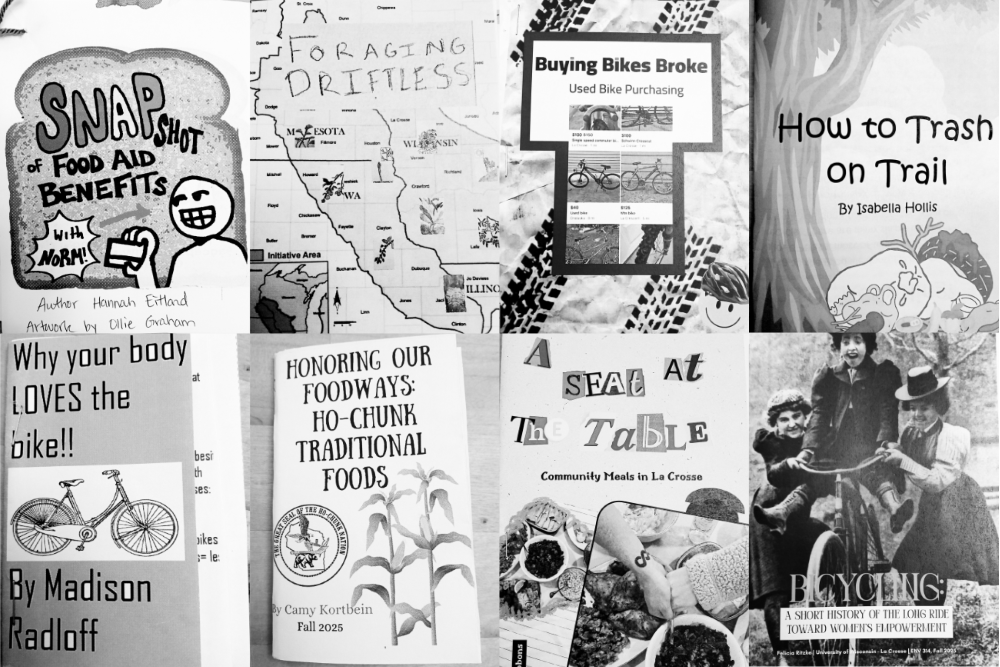 Environmental Studies 351 & 314 with Dr. Margot Higgins explored food justice and transportation justice using zines as primary sources, and through zine creation, allowing students to synthesize research and advocacy in accessible formats.