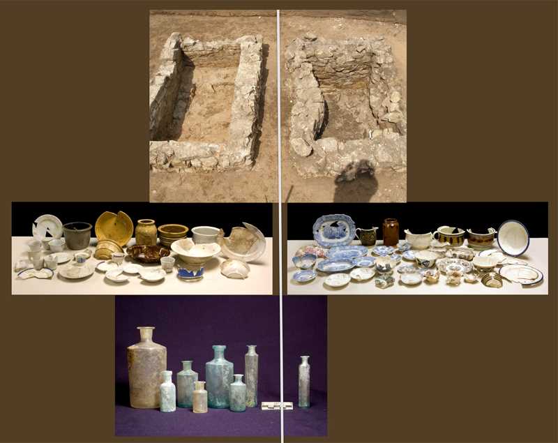 Privy artifacts These two 19th century limestone privies were from a site in Prairie du Chien. As you can see, they were constructed differently, and the one on the left was more solidly built. Artifacts recovered indicated that the privy on the left was later (probably used from the mid- to late 1800s), and the one on the right was earlier (early to mid-1800s). The ceramics photos show more table ware and tea ware from the later foundation (left), and more utilitarian and plain wares from the earlier foundation (right). In the bottom photo, the medicine bottles/vials to the left of the scale came from the later foundation, and the single medicine vial to the right came from the earlier foundation.