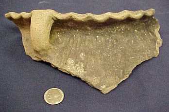 A few pieces of shell tempered pottery were found, which indicates that this is in fact not a Woodland feature because Woodland people used sand or grit to temper their pottery. A few pieces of grit-tempered pottery were recovered as well, indicating dual occupancy of this area of the site, with the later occupants incorporating some of the artifacts from the earlier occupation.