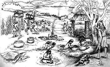 The Oneota and Mississippian traditions are the first full scale farmers in Wisconsin, over 500 years before the arrival of the first Europeans in the state! What caused the southern Woodland people to adapt to this new lifeway? For the answer to that question we need to look outside Wisconsin to southern Illinois. The center of Mississippian tradition was a site called Cahokia across the Mississippi River from the current city of St. Louis, Missouri. Mississippian people in southern Illinois lived in large planned permanent towns with ceremonial centers. Large urban populations were supported by intensive farming of corn, beans and squash.