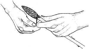 Pressure flaking is the last step in making the stone tool. Very small, thin flakes are carefully removed from around the margins of the tool by applying pressure with an antler tine. This type of flaking strengthens, straightens and sharpens the cutting edges of the tool and shapes the piece into its final form.