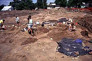 Excavation The Gundersen site is right beneath the modern city of La Crosse. On the edge of a terrace over a backwater channel of the Mississippi River, the site today extends over an area encompassing approximately 20 blocks. The modern city has been built on top of the ancient one. Between 1300 and 1600 AD, people lived in villages, probably farming the Mississippi river bottom lands and living on the drier terrace. Excavations were conducted in a portion of the site in 1991 prior to construction of a parking lot. Here, over 700 storage or garbage pits were found in the area of one city block, as well as several cemetery areas within the village. Lines of postholes were found where posts for structures had been placed in the ground. These may have been houses or other kinds of shelters. Many thousands of fish bones were found, indicating that people fished in the Mississippi River. Evidence also suggests that they were growing a lot of corn, beans and squash for their daily food.