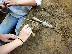 Careful digging with trowel, paint brush, and wooden pick is often required for feature excavation in order to find and map artifacts in place. The soil that is troweled is also screened.