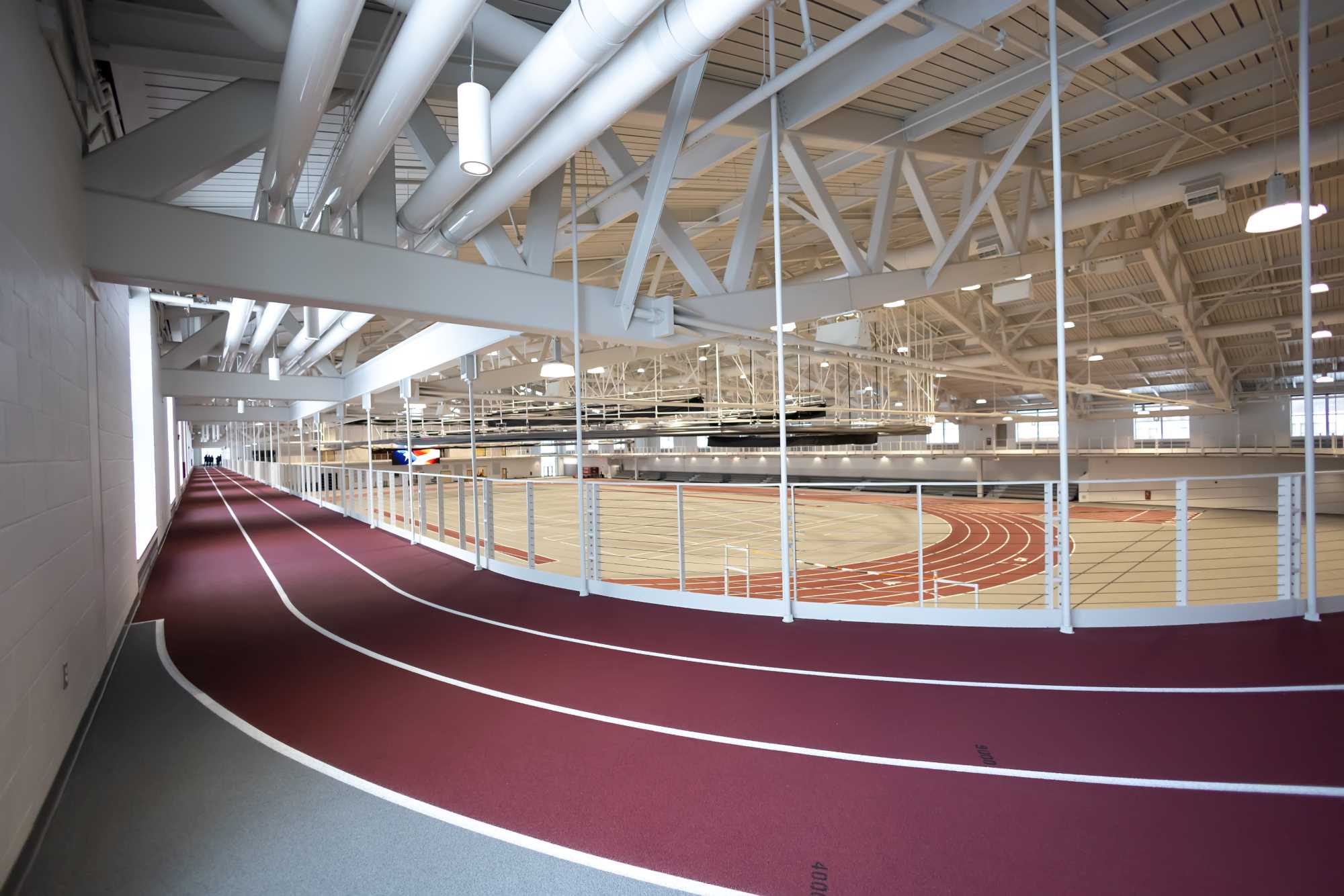 The 144,000 square-foot facility has a 200-meter NCAA competition track, an all-sport-surface infield, a second-floor walking/jogging track, modern locker rooms and meeting spaces, and capacity for 1,500 spectators.