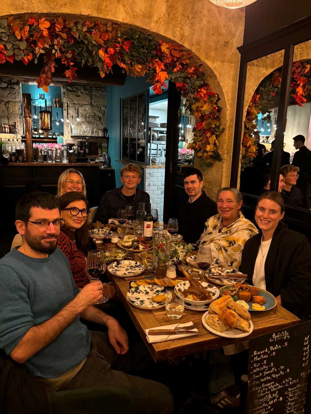 UWL students at dinner with teachers from International Bilingual School of Provence.